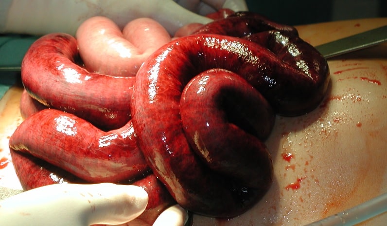 Acute mesenteric ischaemia is the sudden decrease in the blood supply to the bowel, resulting in bowel ischaemia and necrosis. If not identified and promptly treated will rapidly lead to death. The common causes of acute mesenteric ischaemia can be classified into: Thrombus-in-situ (Acute Mesenteric Arterial Thrombosis, AMAT) Embolism (Acute Mesenteric Arterial Embolism, AMAE) Non-occlusive cause (Non-Occlusive Mesenteric Ischemia, NOMI) Venous occlusion and congestion (Mesenteric Venous Thrombosis, MVT) Rarer causes for acute mesenteric ischaemia include Takayasu’s arteritis, fibromuscular dysplasia, polyarteritis nodosa, and thoracic aortic dissection. Type Proportion of Cases Underlying Cause AMAT 25% Atherosclerosis AMAE 50% Cardiac causes* or thoraco-abdominal aneurysm NOMI 20% Hypovolaemic shock, cardiogenic shock MVT <10% Coagulopathy, malignancy, autoimmune disorders *Cardiac causes include arrhythmias (e.g. atrial fibrillation), post-MI mural thrombus, or prosthetic heart valve In this article, we shall look at the causes, clinical features and management of a patient with acute mesenteric ischaemia. Risk Factors The risk factors for acute mesenteric ischaemia depend on the underlying cause. Specifically, however for AMAE, the main reversible risk factors are smoking, hyperlipidaemia, and hypertension, much the same as for chronic mesenteric ischaemia. Clinical Features Traditionally, mesenteric ischaemia presents with a generalised abdominal pain that is out of proportion to the clinical findings, although it can often be more variable or subtle than this. The patient will typically complain of a diffuse and constant pain, with associated nausea and vomiting in around 75% of cases. Abdominal examination will often reveal non-specific tenderness*, with no specific clinical signs. In later stages (especially if the bowel has perforated), patients will have features of globalised peritonism. Importantly, take note of any potential embolic sources, such as atrial fibrillation or heart murmurs, that may provide a suggestion to the underlying cause By THWZ (Own work) [CC BY-SA 3.0], via Wikimedia Commons Figure 1Acute bowel ischaemia, resulting in bowel necrosis Differential Diagnosis Mesenteric ischaemia should always be considered in cases of the acute abdomen, especially where there is no other obvious cause. Other causes of acute abdomen that may have similar presentations include peptic ulcer disease, bowel perforation, and symptomatic abdominal aortic aneurysm Investigations Laboratory Tests An arterial blood gas (ABG) should be performed urgently, to assess the degree of acidosis and serum lactate, secondary to the severity of bowel infarction (however these can be normal, even in severe cases). Routine blood tests that should be performed, including FBC, U&Es, clotting (especially if patient anti-coagulated), amylase*, and LFTs (if the coeliac trunk is affected, ischaemia of the liver may cause derangement), as well as a group and save. *Whilst an amylase is commonly measured to exclude pancreatitis as a cause of the abdominal pain, counter-intuitively amylase also rises in mesenteric ischaemia, as well as ectopic pregnancy, bowel perforation, and diabetic ketoacidosis. Imaging The definitive diagnosis of acute mesenteric ischaemia, for both arterial and venous mesenteric disease, requires a CT scan with intravenous contrast, both in arterial (angiogram) and portal venous phase. Arterial bowel ischaemia will initially show on CT imaging as oedematous bowel, secondary to the ischaemia and vasodilatation, before progressing to a loss of bowel wall enhancement* and then to pneumatosis. In addition, the CT scan should highlight an acute occlusion of typically the superior mesenteric artery or coeliac artery with a halo sign around the occlusion. *Oral contrast should be avoided in cases of mesenteric ischaemia due to difficulty in assessing for bowel wall enhancement By James Heilman, MD (Own work) [CC BY-SA 3.0], via Wikimedia Commons Figure 2CT Scan showing bowel ischaemia Management Initial Management Acute mesenteric ischaemia is a surgical emergency, requiring urgent resuscitation with early senior involvement. Ensure the patient receives intravenous fluids, a urinary catheter inserted, and a fluid balance chart started. For confirmed cases, broad-spectrum antibiotics should be given, due to the risk of faecal contamination in case of perforation of the ischaemic (and potentially necrotic) bowel and bacterial translocation. The patient will have a significant acidosis and is at high risk of developing multi-organ failure, therefore early ITU input to optimise the patient and for post-operative support is necessary. Definitive Management The location, timing, and severity of the mesenteric ischaemia, among other factors, will determine the surgical intervention performed: Excision of necrotic or non-viable bowel, if not suitable for (or able to access) revascularisation Post-operatively the patient should be on the intensive care unit, planned for potential relook laparotomy in 24-48 hours; the majority of patients will end up with either covering loop or end stoma and there is a high chance of short gut syndrome. Revascularisation of the bowel, involving removal of any thrombus or embolism via radiological intervention, either suction thrombectomy or thrombolysis; the decision for revascularisation is made depending upon the state of the patient, the bowel, and the angiographic appearance of the mesenteric vessels. This is preferably done through interventional radiology technique due to the risk of aortic contamination in open surgery, however open embolectomy is possible either through the coeliac trunk, SMA, IMA, or the aorta. Venous ischaemia is typically managed in the same manner, however anticoagulation and bowel resection where required are the mainstay of management Complications The main risks from mesenteric ischaemia are bowel necrosis and perforation. The mort