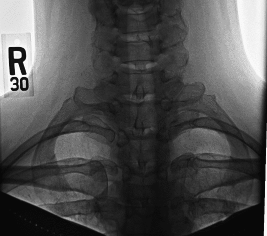 Thoracic outlet syndrome (TOS) refers to the clinical features that arise from compression of the neurovascular bundle within the thoracic outlet. The signs and symptoms that arise can be divided into neurological (nTOS, most common), venous (vTOS), and arterial (aTOS). Most people affected are between 20-50 years old. It usually occurs in the setting of hyperextension injuries, repetitive stress injuries (e.g. work-related, particularly when working over the head), or external compressing factors (e.g. poor posture), but can also be secondary to anatomical abnormalities, including that of the 1st rib, an anomalous cervical rib, or bands within the thoracic outlet. By TeachMeSeries Ltd (2020) Figure 1The brachial plexus as it passes through the thoracic outlet Pathophysiology The brachial plexus and subclavian artery pass through the scalene triangle, and the subclavian vein passes anterior to anterior scalene. The brachial plexus can be compressed between the anterior and middle scalene muscles, or against the 1st rib or a cervical rib; typically, it is the lower cord which becomes irritated (resulting in symptoms affecting the ulnar distribution). As such, hypertrophy of the scalene muscles, abnormality in the first rib, or the presence of a cervical rib can all lead to compression on the brachial plexus or subclavian artery. Previous clavicle fracture can cause abnormal bony healing that compresses on the thoracic outlet. The presence of a costoclavicular ligament can reduce the costoclavicular space, leading to vTOS, due to positional venous obstruction. Cervical Rib A cervical rib is an extra rib that arises from the seventh cervical vertebra (Fig. 2). It occurs in 0.2-0.5% of the population and can be partial or complete. Whilst this increases the risk of thoracic outlet syndrome, the majority of patients with a cervical rib are unaware of it and causes no symptoms. Identification of a cervical rib in an otherwise asymptomatic patient does not warrant any intervention. Risk Factors Recent trauma, repetitive motion occupations, athletes*, or anatomical variations are potential risk factors for TOS *It is more common in athletes that use repetitive arm motions, such as swimming and racquet sports, and in bodybuilders Clinical Features The specific clinical features present will be dependent on neurological, arterial, or venous involvement. Symptoms may also worsen with certain movements, e.g. shoulder abduction or extension. Compression of the brachial plexus can cause paraesthesia and/or motor weakness, which is often in the ulnar distribution; there may be muscle wasting, and pain can radiate to the neck and upper part of the back Venous compression can lead to deep vein thrombosis and extremity swelling (termed Paget-Schrötter syndrome); in untreated severe cases, there can be prominent veins over the shoulder due to collateralisation Arterial compression can cause claudication symptoms or acute limb ischaemia through either occlusion, distal embolisation, or aneurysm formation On examination, assess for areas of weakness or numbness, for swelling or tenderness, and any features of limb ischaemia. Tenderness over the scalene muscles is often present. Special Tests for Thoracic Outlet Syndrome Adson’s manoeuvre – Palpate the radial pulse on the affected side, with the arm initially abducted to 30 degrees, then ask the patient to turn their head and look at the affected side’s shoulder; fully abduct, extend, and laterally rotate the shoulder Any decrease or loss of pulse is suggestive of TOS Roo’s test – Abduct and externally rotate the shoulder on the affected side to 90 degrees, bend the elbow to 90 degrees, then ask the patient to open and close the hands slowly over a 3-minute period Any worsening of symptoms will develop if TOS is present Elvey’s test – Extend the arm to 90 degrees, with the elbow extended and wrist dorsiflexed, then tilt the patients ear to each shoulder Any loss of the radial pulse or worsening symptoms is suggestive of TOS Investigations Initial blood tests should be taken, including FBC and clotting screen (further specialist haematological testing may be warranted later for further assessment). A chest radiograph (CXR) is important to identify potential bony abnormalities* such as cervical ribs (Fig. 2), long transverse cervical processes, or rib/clavicular fracture calluses *Over 90% of aTOS patients will have a bony abnormality By Huntsville Hospital Imaging (XRays Huntsville Hospital 2015) [Public domain], via Wikimedia Commons Figure 2Bilateral cervical ribs, as seen on chest radiograph Further Investigations For suspected venous or arterial TOS, common tests used for diagnosis include initially a venous and arterial duplex ultrasound study, particularly with the patient at rest and with the arm in stress positions to look for any compression. CT or MRI imaging or a venogram may be required for further assessment. For neurogenic cases, nerve conduction studies are a common investigation, as they allow detection of decreased action potential conductance because of nerve compression. Typically, they are used to rule out carpal tunnel and cubital tunnel syndrome, rather than diagnose nTOS. MRI imaging can be used for detection of cervical ribs and fibrous bands, if suspected. Any patient presenting with acute limb ischaemia secondary to aTOS needs an urgent CT angiogram arranged. Management The treatment approach depends upon the type of TOS For nTOS, the first line management is physiotherapy, over the course of around 6 months, aiming to improve mobility in the neck and shoulder, strengthen the surrounding muscles, and relax the scalene muscles. Botulinum toxin injections can also be effective to help relax the scalene muscles, often done concurrently to aid physiotherapy. Patients with vTOS may need thrombolysis and anti-coagulation, under guidance form the haematology teams, however most cases will need surgical management to decompress
